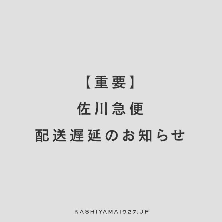 INFORMATION 2025.12.02 NEW 【重要】佐川急便 配送遅延のお知らせ いつもKASHIYAMAをご利用いただき、誠にありがとうございます。 現在、急激な物量の増加に伴い、全国的に荷物のお届けに遅れが生じており、お届け日時をご指定いただいている場合でも遅延する可能性がございます。 また、この状況から、佐川急便の会員制ウェブサービス「スマートクラブ」、及び「LINE」配信の「配達予定通知」についても一時的に配信を停止しております。 詳細は、佐川急便のサイトでご確認くださいませ。 たいへんご迷惑をおかけしますが、何卒ご理解・ご了承くださいますようお願い申し上げます。 SHARE FacebookTwitter