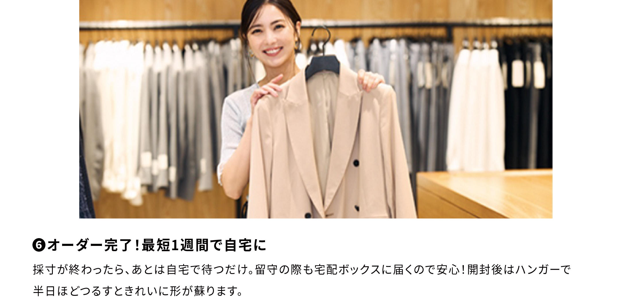 肩がけした時、羽織ったとき、きれいな見え方を吟味して0.5cmだけ着丈をプラス。0.5cm単位で長さを調節、とことんこだわれるのもオーダーならでは。