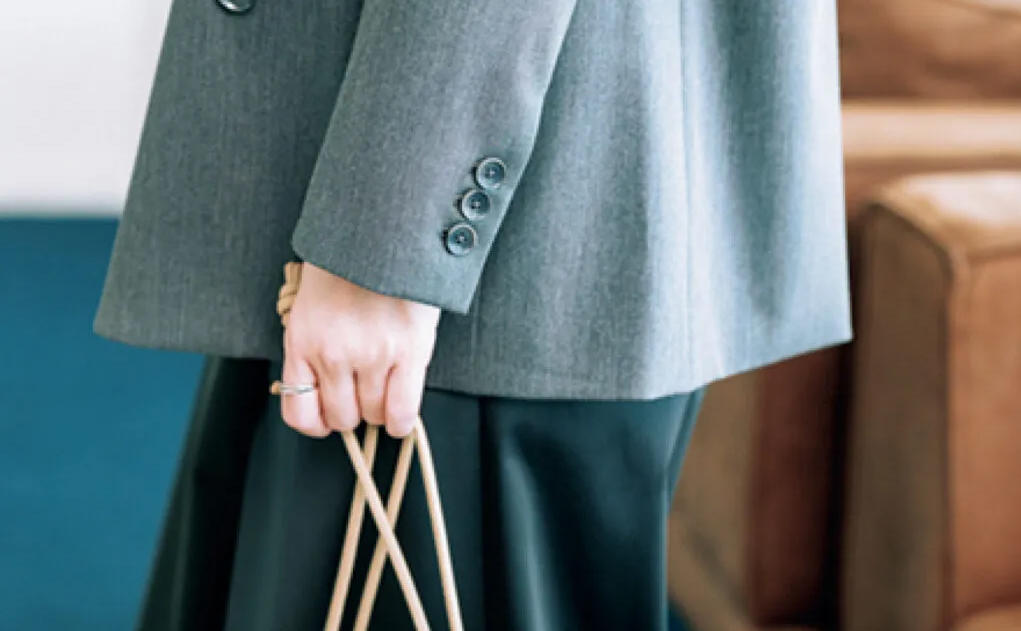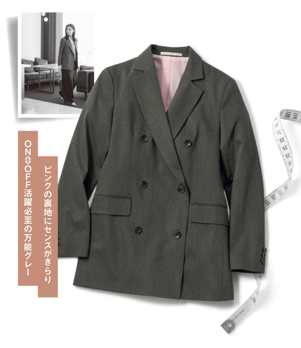 ハンサムで女っぽいグレージャケットは目上の方にも後輩にも好感度。緊張感もある社外の人との初打ち合わせ、裏地の優しいピンクが背中を押してくれる!