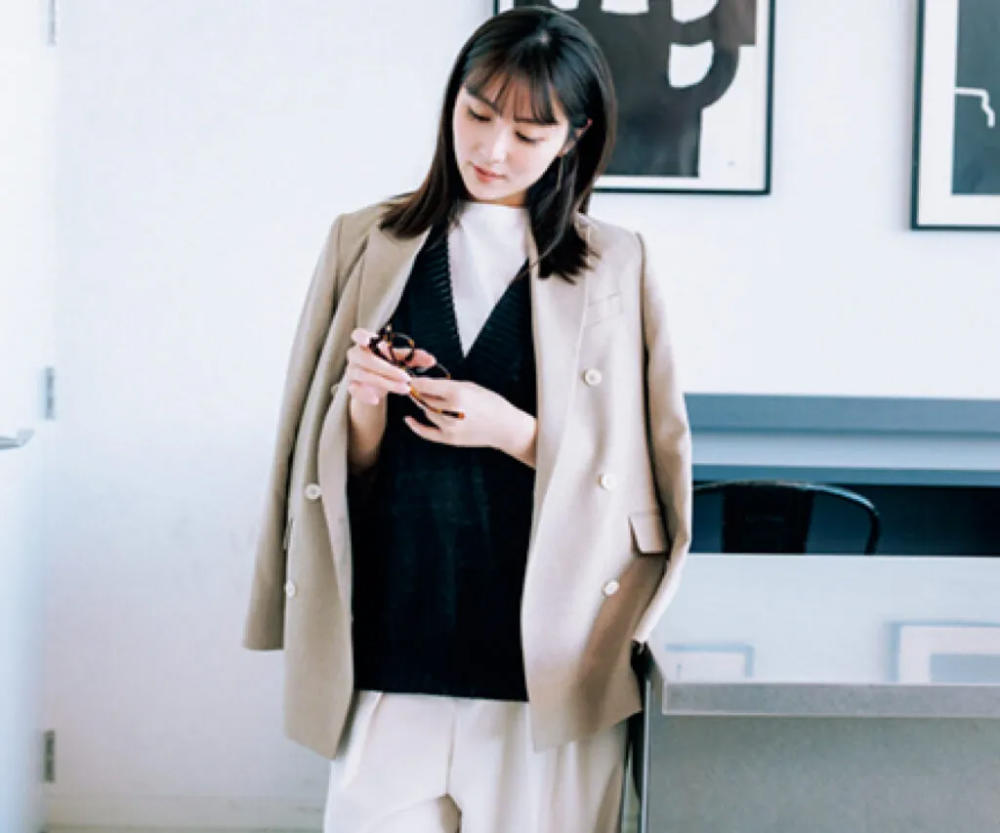 仕事服の自由度高め、ジャケットも選びも高感度な目利きで楽しみたいフリーランスはサイズ感に こだわりあえてのオーバーサイズが余裕に直結、メンズっぽベージュがこなれて見える!