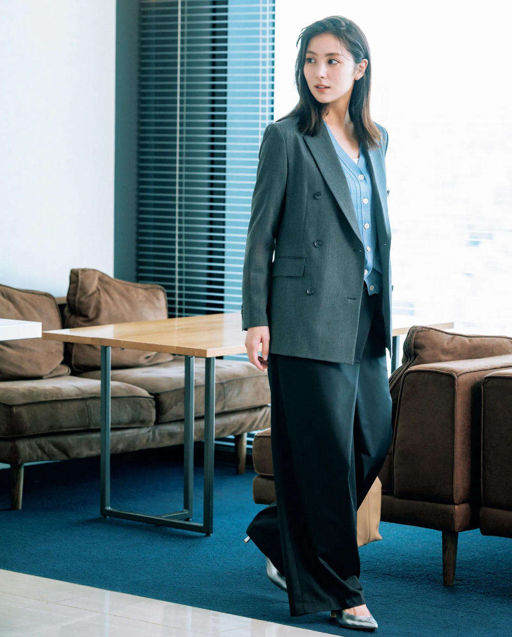 ジャケット(KASHIYAMA/オンワード樫山 お客様相談室) カーディガン¥39,600(スローン/ザ ショップ スローン 新静岡セノバ店) パンツ¥36,300(エス) ピアス¥29,700 リング¥13,200(ともにヴイエー ヴァンドーム青山/ヴイエー ヴァンドーム青山 有楽町マルイ店) バッグ¥53,900(ヴァジック/ヴァジックジャパン) パンプス¥23,980(J&M デヴィッドソン/モーダ・クレア)