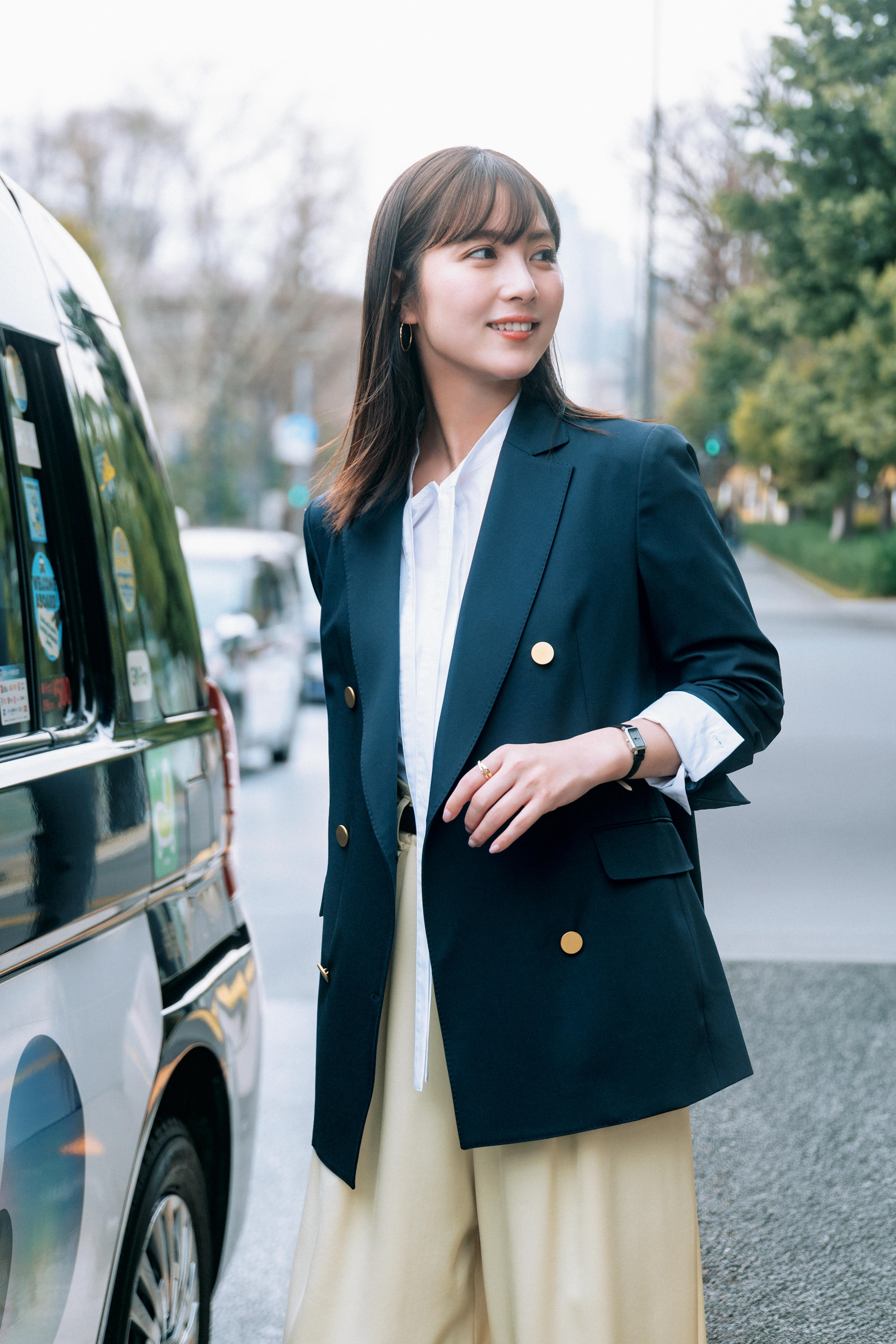ジャケット(KASHIYAMA/オンワード樫山 お客様相談室) カーディガン¥39,600(スローン/ザ ショップ スローン 新静岡セノバ店) パンツ¥36,300(エス) ピアス¥29,700 リング¥13,200(ともにヴイエー ヴァンドーム青山/ヴイエー ヴァンドーム青山 有楽町マルイ店) バッグ¥53,900(ヴァジック/ヴァジックジャパン) パンプス¥23,980(J&M デヴィッドソン/モーダ・クレア)