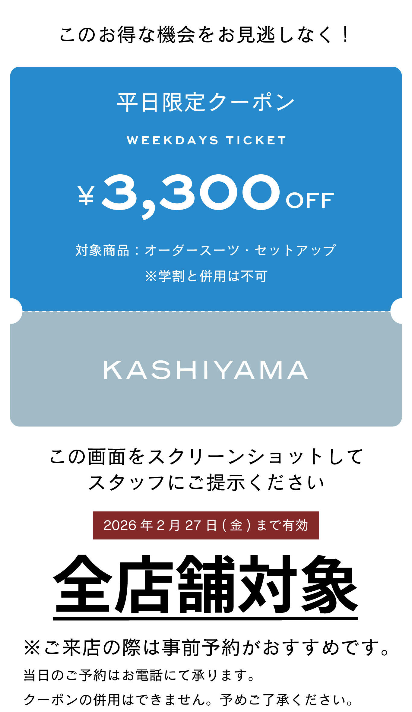 平日限定で使えるお得な3,300円OFFクーポン配布中!全国のKASHIYAMA SHOPでご利用いただけます。
